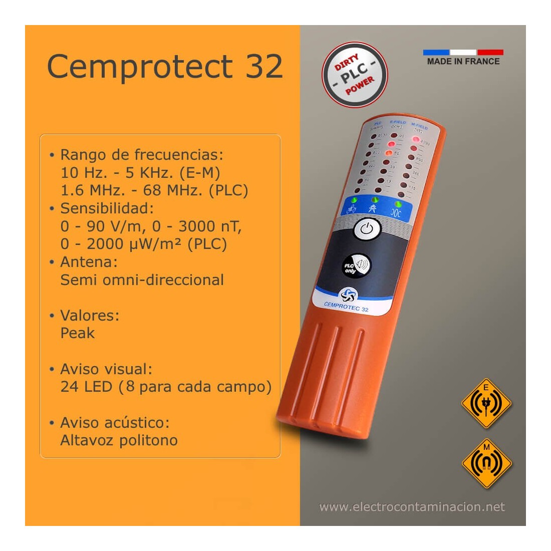 - El detector de ondas electromagnéticas CEMPROTEC 32 es el primer detector que puede utilizarse para comprobar simultáneamente la exposición a radiaciones eléctricas y magnéticas, así como a radiaciones procedentes de sistemas PLC de banda ancha que son consideradas electricidad sucia (Dirty Power).