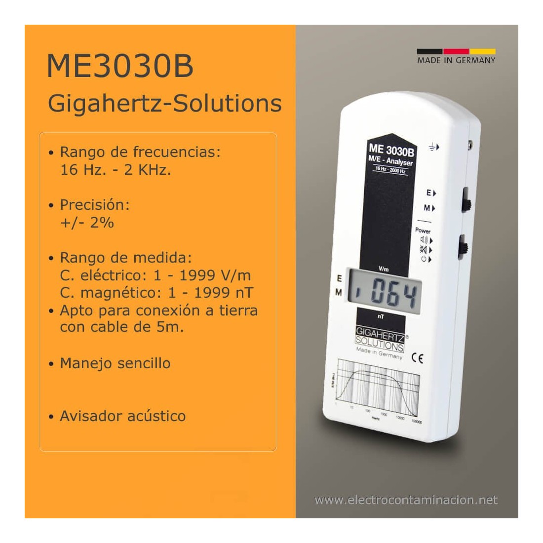 - El medidor de campos eléctricos y magnéticos de baja frecuencia Gigahertz-Solutions ME3030B es el modelo de entrada (orientado para el uso doméstico) de la marca alemana.