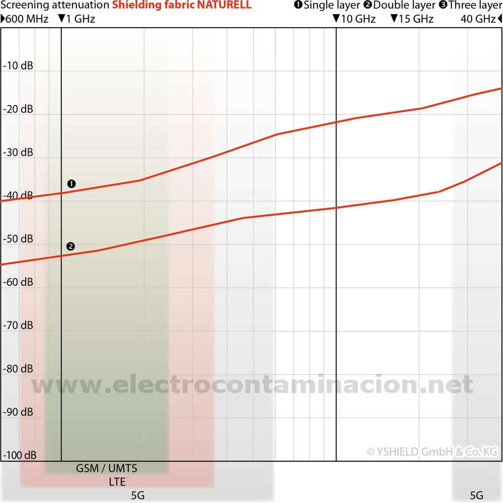 - La medición de atenuación de las ondas electromagnéticas >de 40/600 MHz a 40 GHz< se ha realizado (dependiendo de las propiedades del material) de acuerdo con la norma IEEE Std 299™-2006 o de acuerdo con la norma ASTM D4935-10 (vea arriba la foto de la gráfica de atenuación).