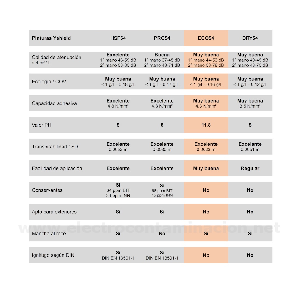 La pintura apantallante, de blindaje electromagnético YSHIELD ECO54 compuesta por carbono y grafito le permitirá evitar las altas frecuencias por reflexión y las bajas frecuencias por derivación a tierra. Indicado también para la 5G y RFID.