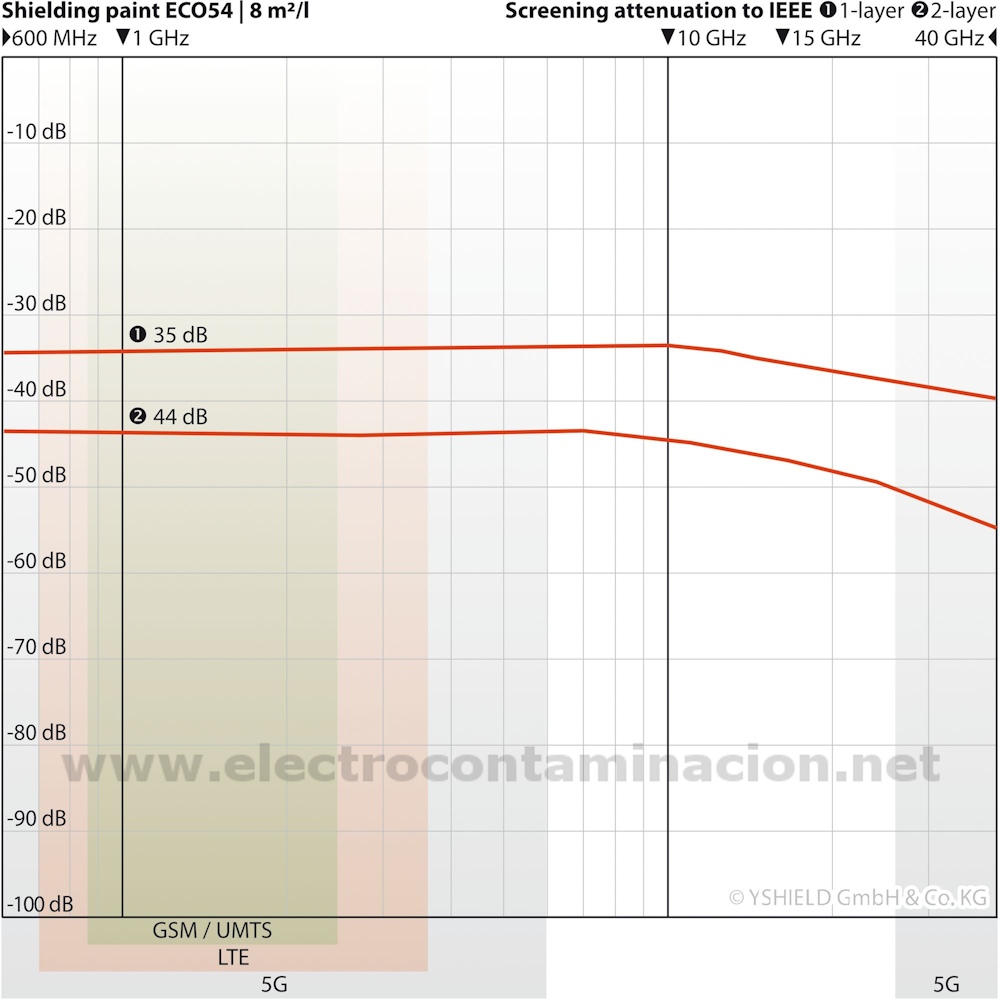 • Indicado para la 5G: Esta pintura de Yshield muestra una linealidad en la calidad de atenuación excelente, pudiendo apantallar el espectro de frecuencias hasta más allá de los 40 GHz., consiguiendo valores de atenuación superiores a 50 dB y una eficacia de apantallamiento en ambos espectros de frecuencia 5G-FR1 (600 MHz - 6 GHz) y 5G-FR2 (24 GHz - 40 GHz).