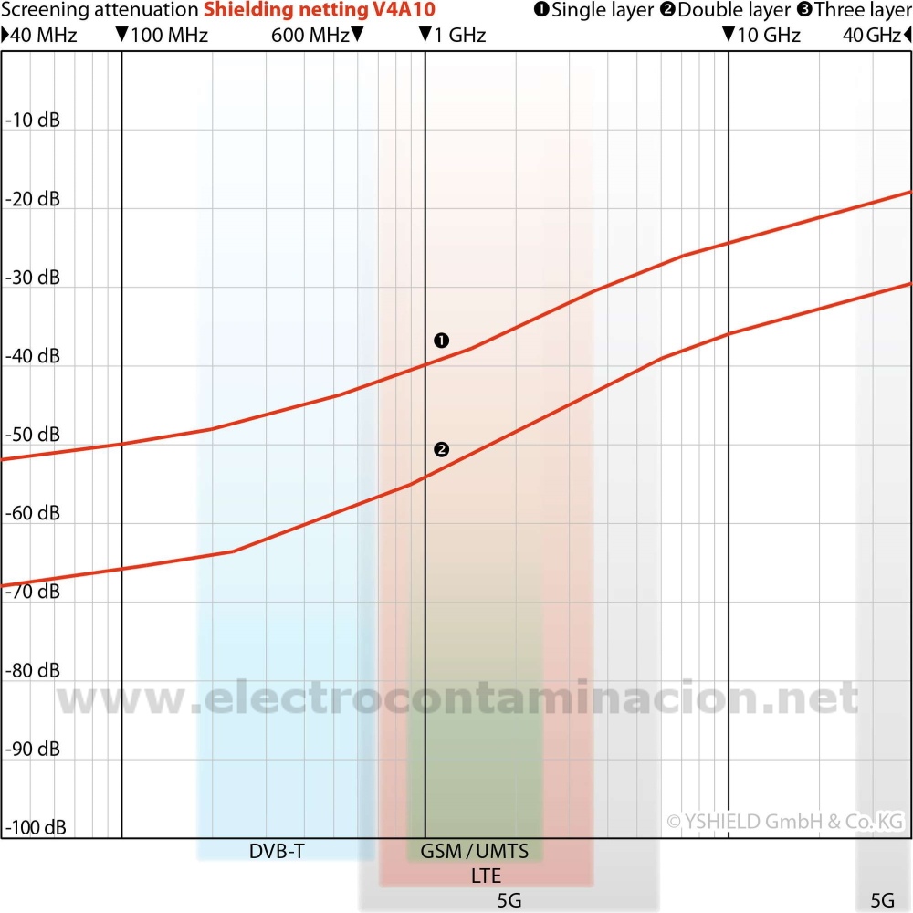 - La medición de atenuación de las ondas electromagnéticas >de 40/600 MHz a 40 GHz< se ha realizado (dependiendo de las propiedades del material) de acuerdo con la norma IEEE Std 299™-2006 o de acuerdo con la norma ASTM D4935-10 (vea arriba la foto de la gráfica de atenuación).