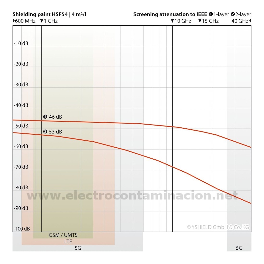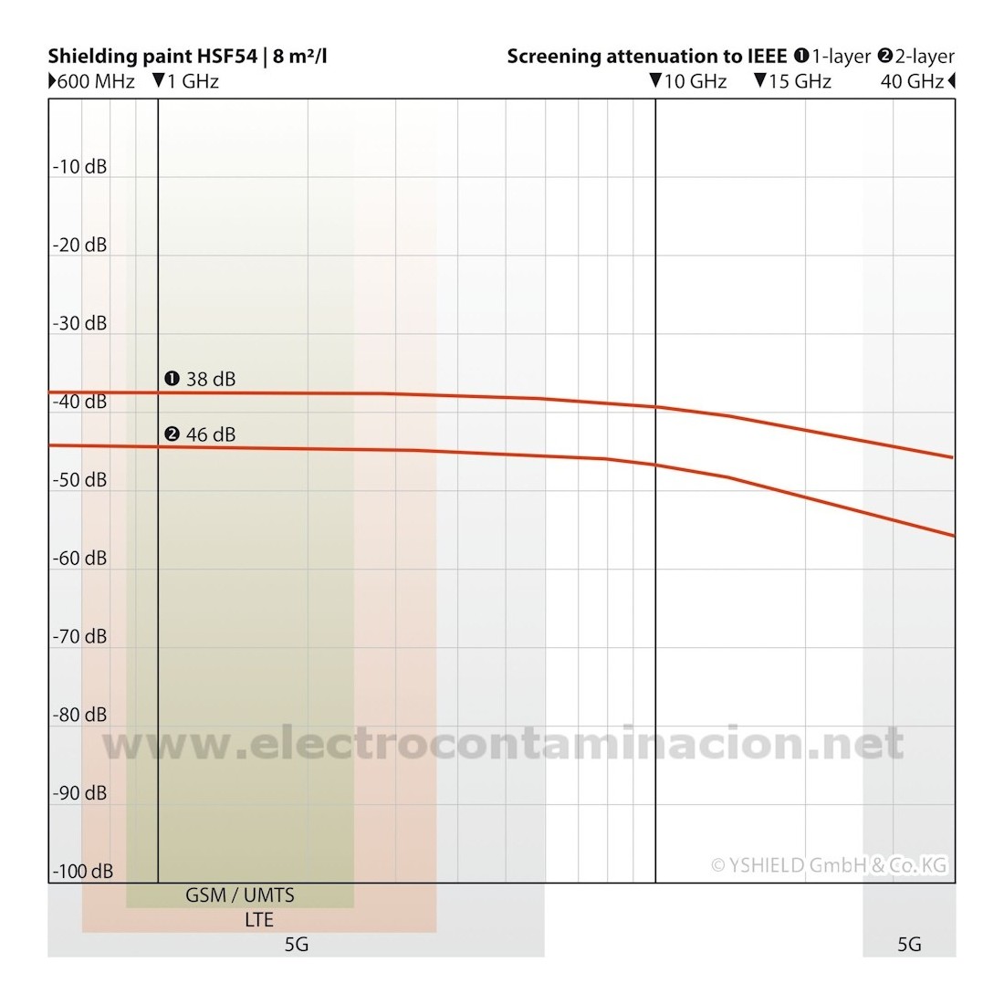 • Indicado para la 5G: Esta pintura de Yshield muestra una linealidad en la calidad de atenuación excelente, pudiendo apantallar el espectro de frecuencias hasta más allá de los 40 GHz., consiguiendo valores de atenuación superiores a 50 dB y una eficacia de apantallamiento en ambos espectros de frecuencia 5G-FR1 (600 MHz - 6 GHz) y 5G-FR2 (24 GHz - 40 GHz).