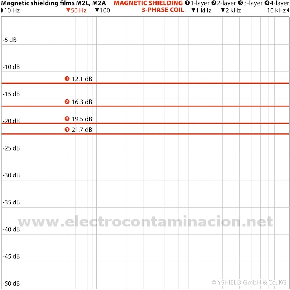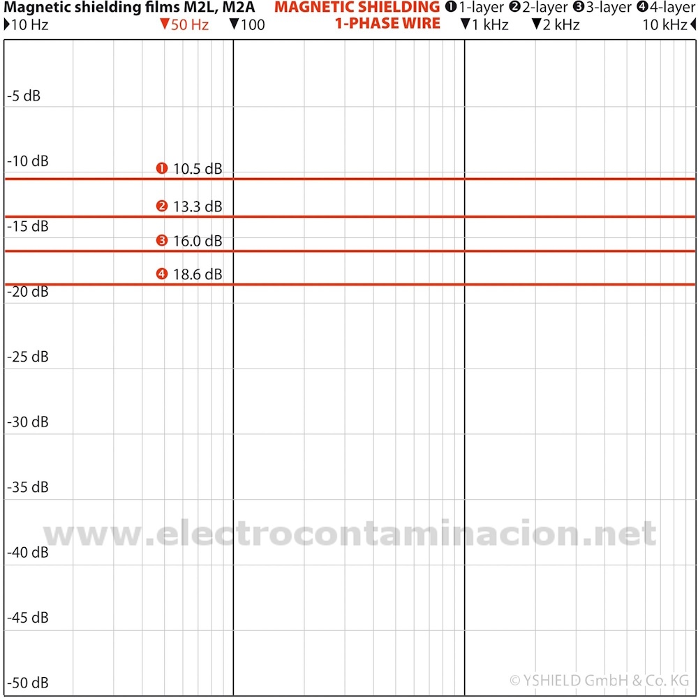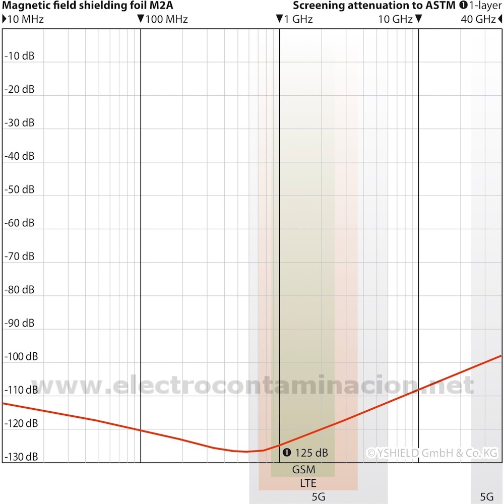 - Capacidad de atenuación de campo magnético estático: Los consumidores de corriente continua, el campo magnético terrestre, los imanes permanentes sólo se apantallan con muchas capas de M2A.