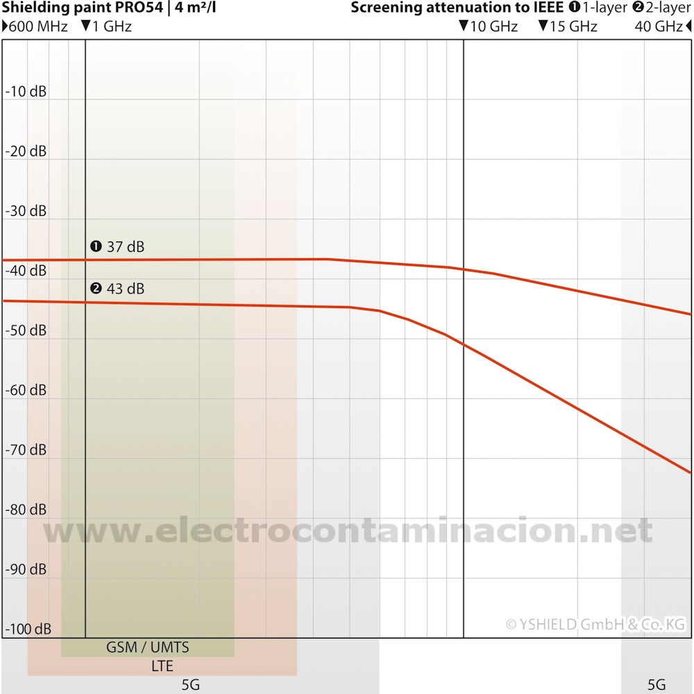 Indicado para la 5G: Esta pintura de Yshield muestra una linealidad en la calidad de atenuación excelente, pudiendo apantallar el espectro de frecuencias hasta más allá de los 40 GHz., consiguiendo valores de atenuación superiores a 50 dB y una eficacia de apantallamiento en ambos espectros de frecuencia 5G-FR1 (600 MHz - 6 GHz) y 5G-FR2 (24 GHz - 40 GHz).
