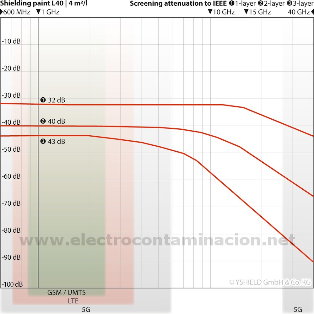La pintura apantallante, de aislamiento o de blindaje electromagnético YSHIELD HSF54 compuesta por carbono y grafito le permitirá evitar las altas frecuencias por reflexión y las bajas frecuencias por derivación a tierra.